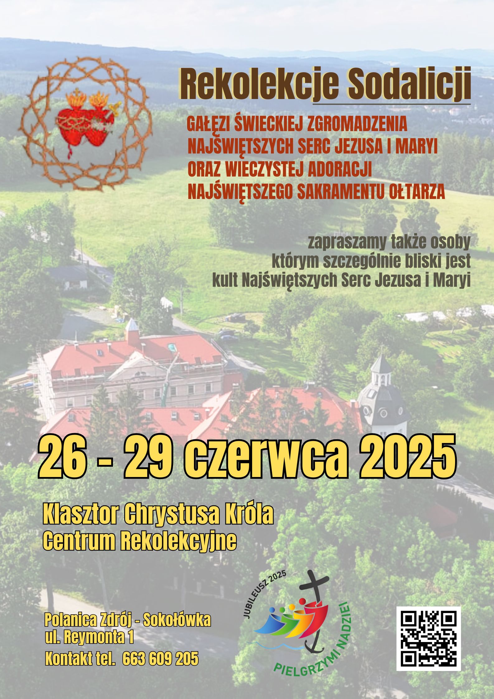 W tym roku odbędą się w dniach od 26 do 29 czerwca w Klasztorze Chrystusa Króla w Polanicy Zdroju. Szczególnie serdecznie zapraszamy także osoby, którym bliski jest kult Najświętszych Serc Jezusa i Maryi. Zgłoszenia uczestnictwa w rekolekcjach można zgłaszać pod numerem telefonu: 663 609 205.